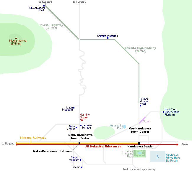 Seibu buses operate almost hourly between Karuizawa Station, Naka-Karuizawa Station and the Onioshidashi Park. The one way ride between Karuizawa Station and the park takes 35 minutes and costs 1210 yen.